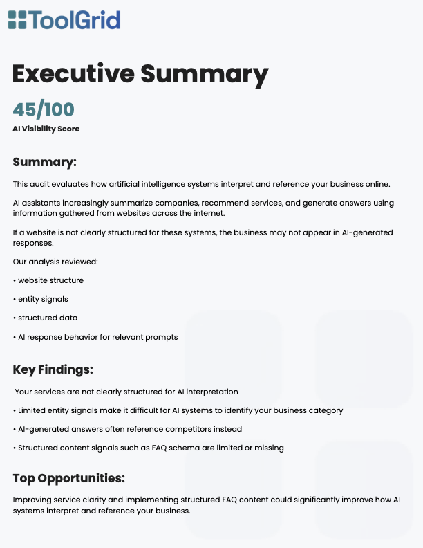 The audit tells you exactly what to change. ToolGrid can implement those changes—from schema and structured data to full AI systems and automation workflows.